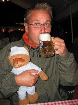 ja aurinko paistaa. Seilaamme pitkin jokea olutta hörppien. Nälkä alkaa vaivata ja päätämme nauttia lounaan. Saan pitkästä aikaa sushia. Massu täyttyy ja sitten käväisemään hotellilla. Istuskelemme hetken kattoterassilla ja tyhjennämme pullollisen punaviiniä. Sitten onkin aika suunnata kohti olutfestivaalia. Otamme omat tuoppimme ja lähdemme kävelemään kohti festarialuetta. Kaljakojua kaljakojun jälkeen ja pituutta alueella on lähes kaksi kilometriä. Pienen tuopin täyttö maksaa mukavasti euron eli ei muuta kuin maistelemaan. Ilma muuttuu sateiseksi ja istuskelemme aina varjojen alla. Mutta hauskaa on ... juomme olutta kuin viimeistä päivää. Istahdamme hetkiseksi meksikolaiseen ravintolaan. Massut ovat täynnä olutta ja vaihteeksi mieli tekee jotain muuta juotavaa. Kohtaloksemme koituu lause ... hei täältä saa mansikkamargariittoja litran kannuissa ...